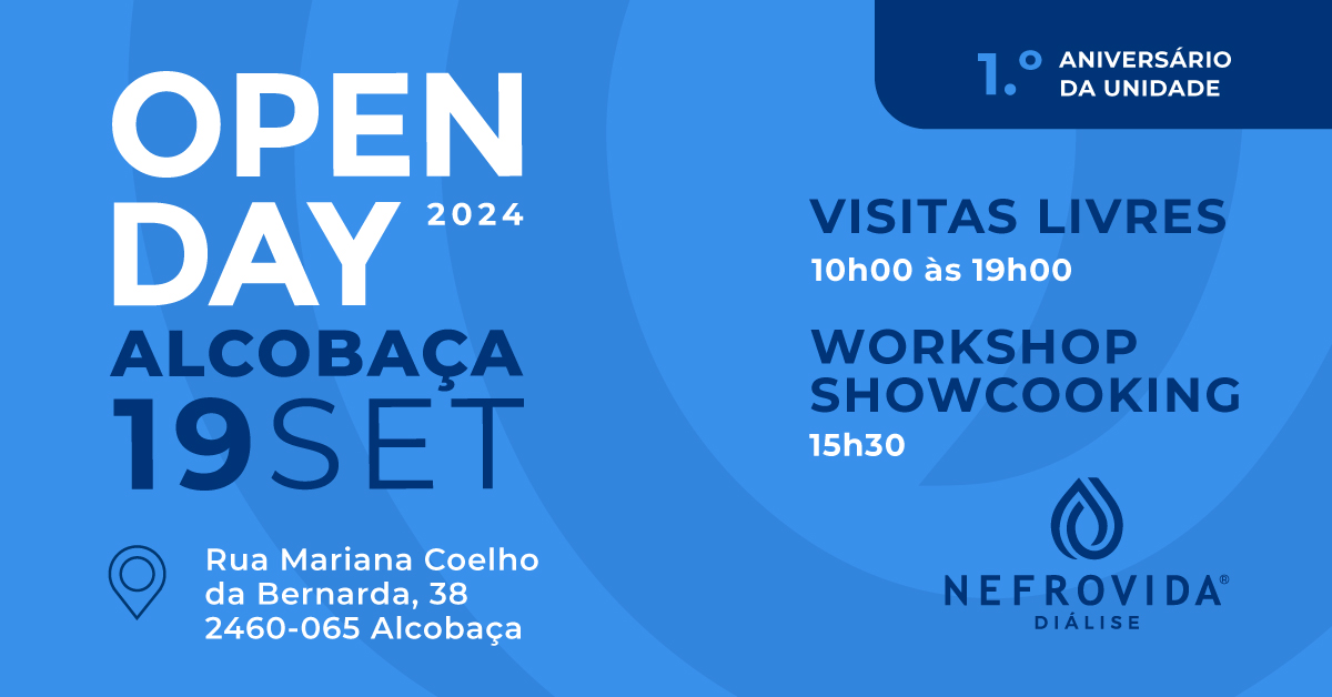 No âmbito da comemoração do seu 1º aniversário, a NEFROVIDA convida todos os interessados a participar no seu Open Day, que terá lugar na Unidade de Diálise de Alcobaça, no dia 19 de setembro de 2024, seguido de workshop com showcooking pelas 15h30m.